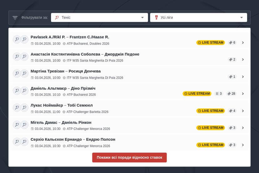 Окремо варто відзначити букмекерські платформи, які пропонують live-стріми матчів. Це можливість дивитися French Open у високій якості прямо під час ставок, не перемикаючись між різними сервісами. Усе відбувається в одному вікні — трансляція, коефіцієнти та статистика в реальному часі. Такий формат робить перегляд більш захопливим і динамічним. Кожен гейм, брейк або важливий розіграш можна одразу використати для прийняття рішення, а live-ставки додають ще більше емоцій і контролю над процесом.